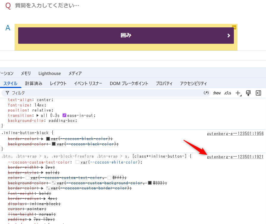 「ボタン」「囲みボタン」ブロックのカスタムカラーは、親のstyle属性にCSSプロパティ変数として登録される。