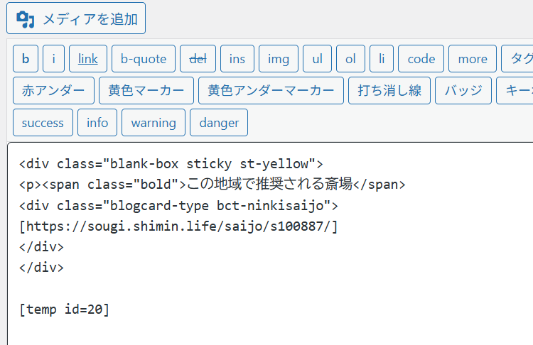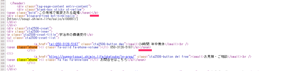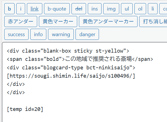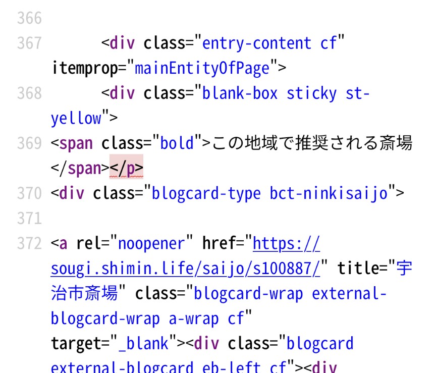 なお、<p><span class="bold">この地域で推奨される斎場</span>の部分で先頭だけ<p>を入れておりますのは、</p>のみが勝手に入ってしまうため、@大門未知子様からのご指摘を踏まえ今回追記したものでございます。