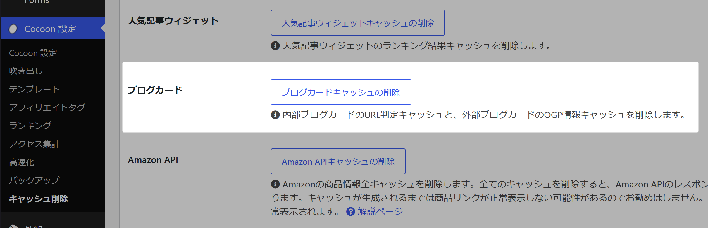 また、該当ページを再読み込みする前に、Cocoon設定のサブメニューであるキャッシュの削除で、ブログカードキャッシュの削除を行ってみてください。