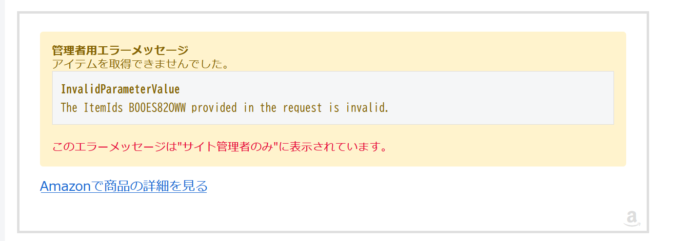 しかし、今まで正常に動作していたAmazonアソシエイトリンクが一律「管理者用エラーメッセージ 商品を取得できませんでした。存在しないASINを指定している可能性があります。(ASIN:B089F2K11Q)」といった具合で画像情報等が表示されず、テキストリンクのみになってしまいました。