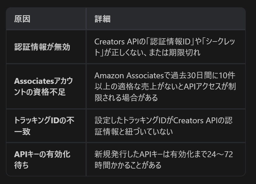 そのエラーメッセージ(CreatorsApiHttpError HTTP 403)が原因になるケースは、主に添付画像のような場合があります。