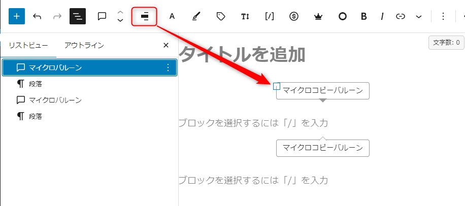 「マイクロバルーン」ブロックを「右寄せ」で配置したところ、Gutenberg エディター上では図のように「中央揃え」で表示される。