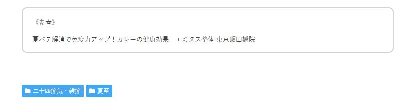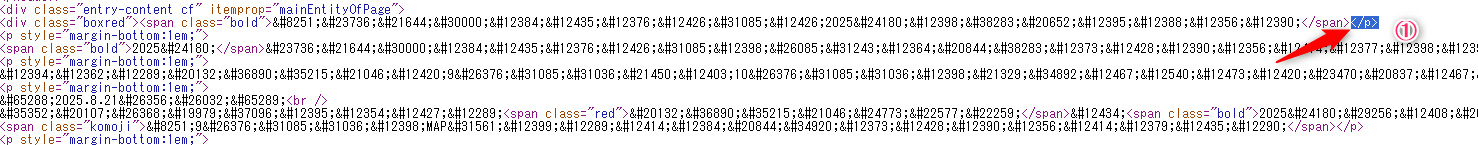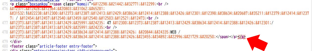 ご指摘いただいた記事を開いて、投稿画面をみたところ、文末の囲み内の閉じタグが、抜けていたので追加したところですが、投稿画面の記載は