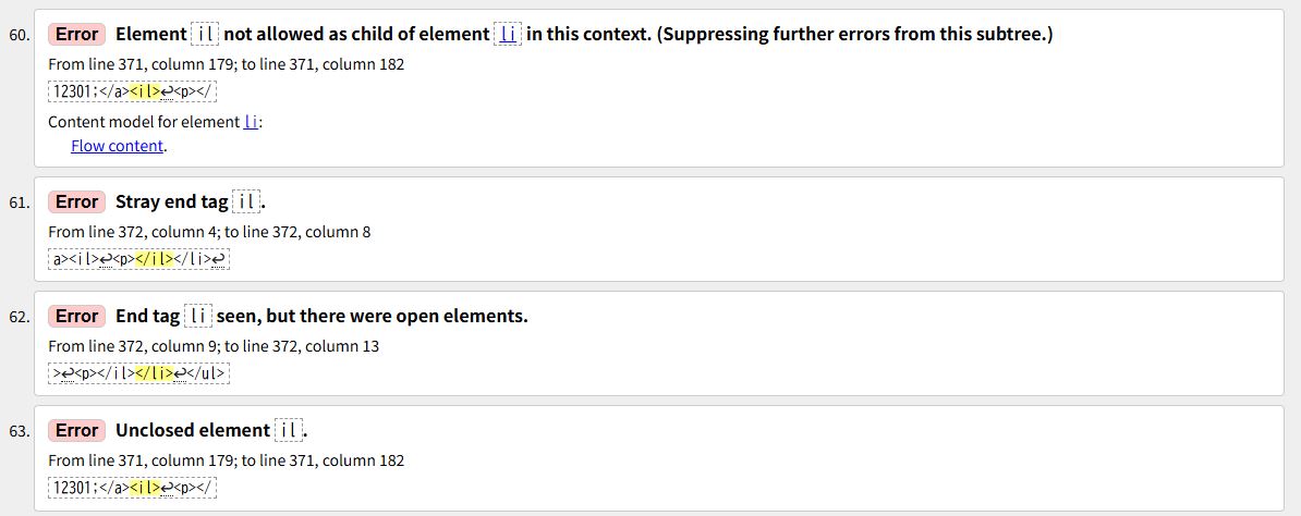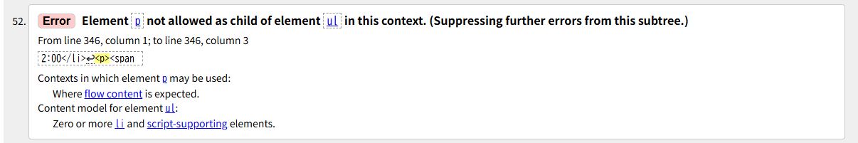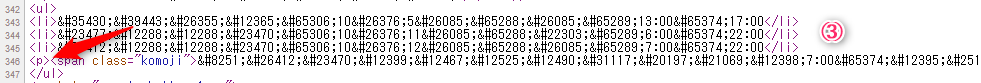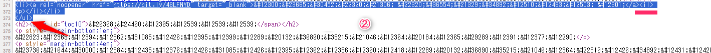 ②の部分は、pタグの開始タグと、liタグの閉じタグが2つありますが、これら相手がいないと思います。