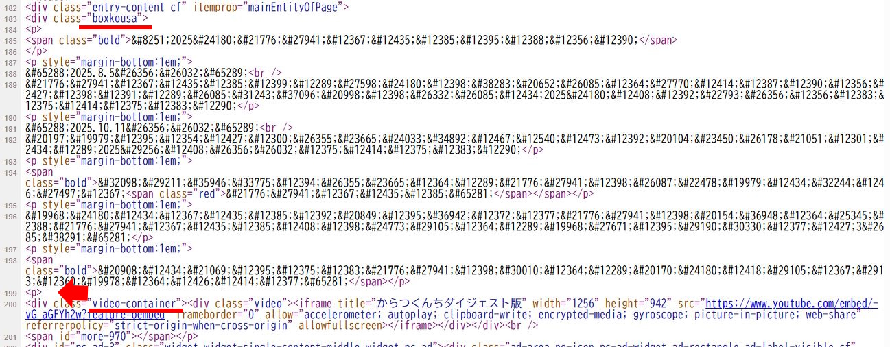 - 本文全体が該当classのdivタグで囲まれている状態のため、本文全体にCSSが適用される