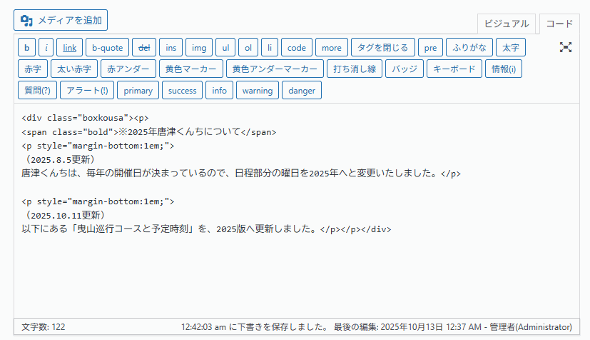 記事の更新状況を伝えたりすると時に、記事最上部に箇条書きで書いて、その部分だけ囲っていたのですが、その囲みが、記事全体を包んでしまっています。