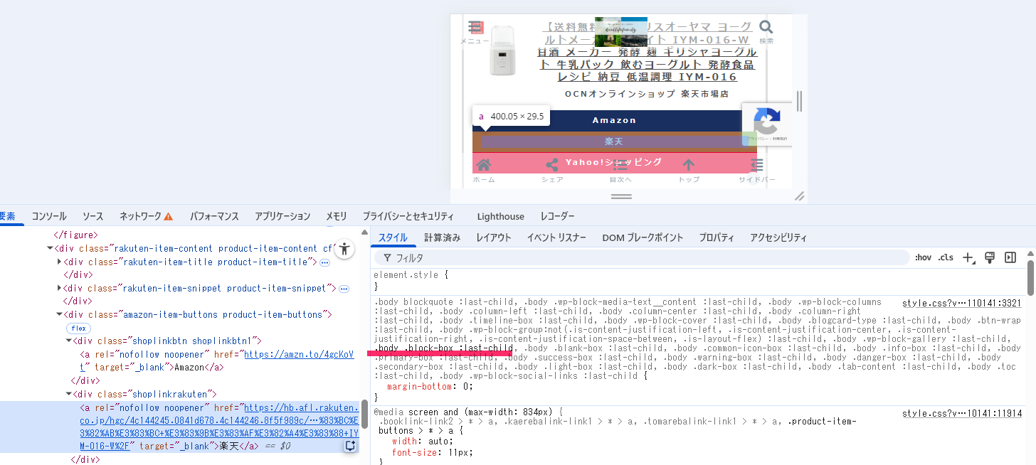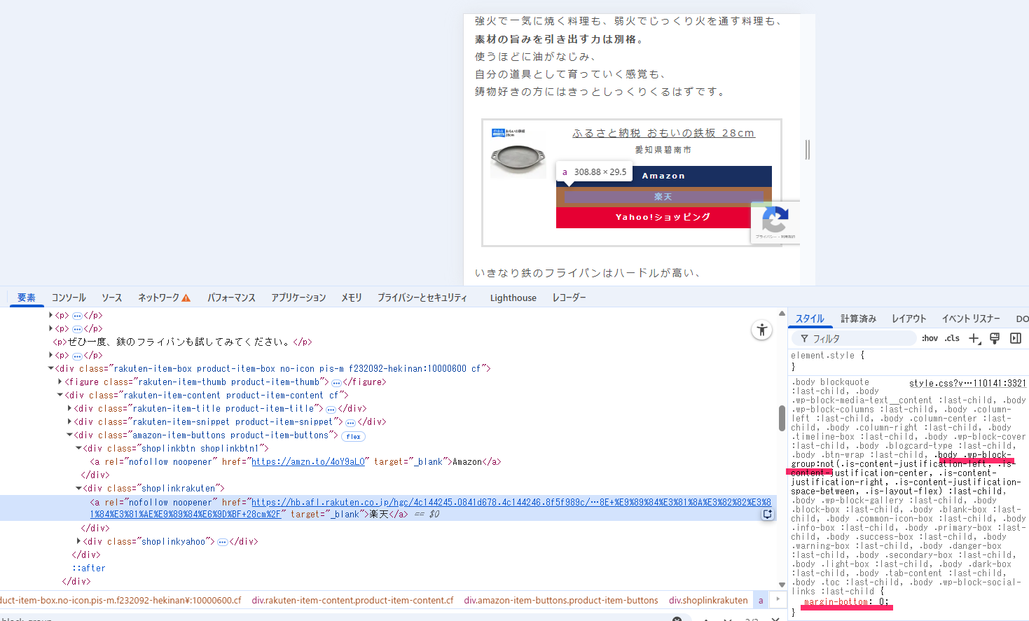 同じショートコードを使用していますが、本文の中のアフィリエイトボタンが隙間あり、記事最後の使用しているテンプレートにあるアフィリエイトボタンが繋がってしまう