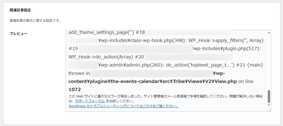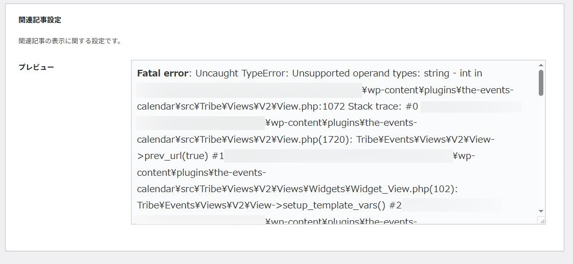 良く見ると、「投稿」タブの「関連記事設定」のプレビューにエラー出ていました。