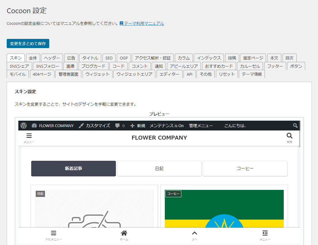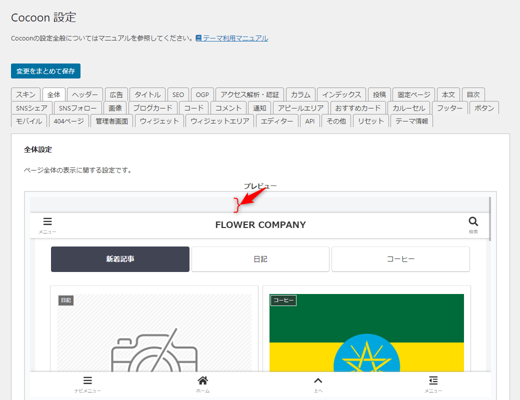 ブラウザ幅が小さいとき、Cocoon設定画面のプレビューの表示もモバイル表示となる。