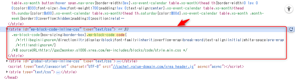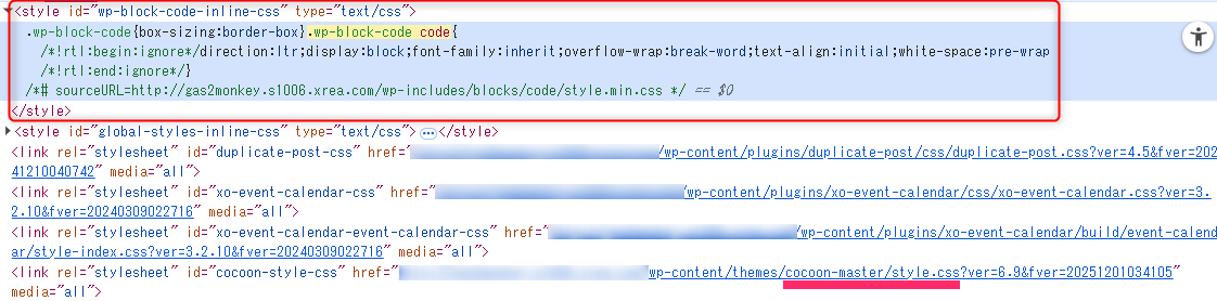「CSSを縮小化する」オンにすると、<style id="wp-block-code-inline-css" type="text/css">の方が、縮小化により圧縮したCSSSより後に展開される(オフとは逆になる)。