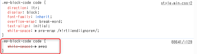 [Cocoon設定]→[高速化]→CSS縮小化「CSSを縮小化する」をオンにすると「コード」ブロックが横スクロールせず、折り返し表示される。