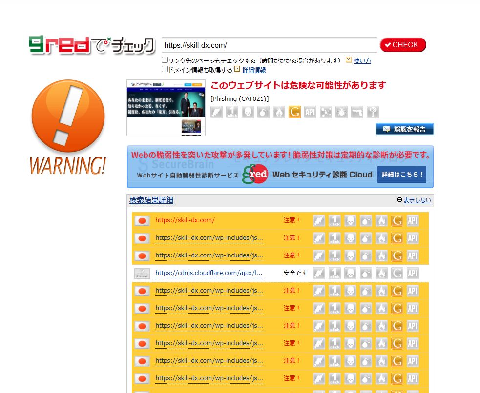 GREDを見ても、以下のように危険なサイト判定。