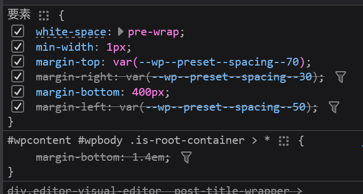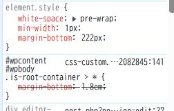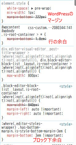 先述の通り、.is-root-containerの子要素(各ブロック)のmarginにimportantが付いており。