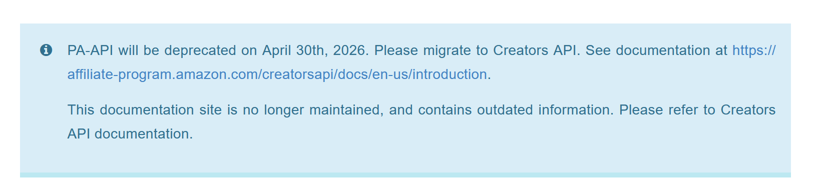 このたび、PA-API v5エンドポイントは、2026年5月15日(金)をもってサービスを終了いたします。PA-APIを利用したコンテンツへの影響を避けるため、同日までに新しいCreators APIへの移行をお願いいたします。移行手順の詳細については、 こちらの資料をご確認ください。
