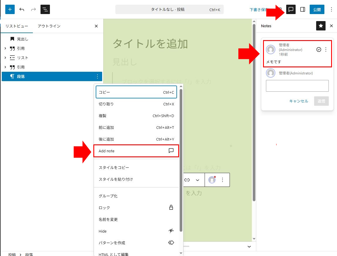 1つ1つのブロックに、コメント(メモ・注釈)のようなものを追加できます。