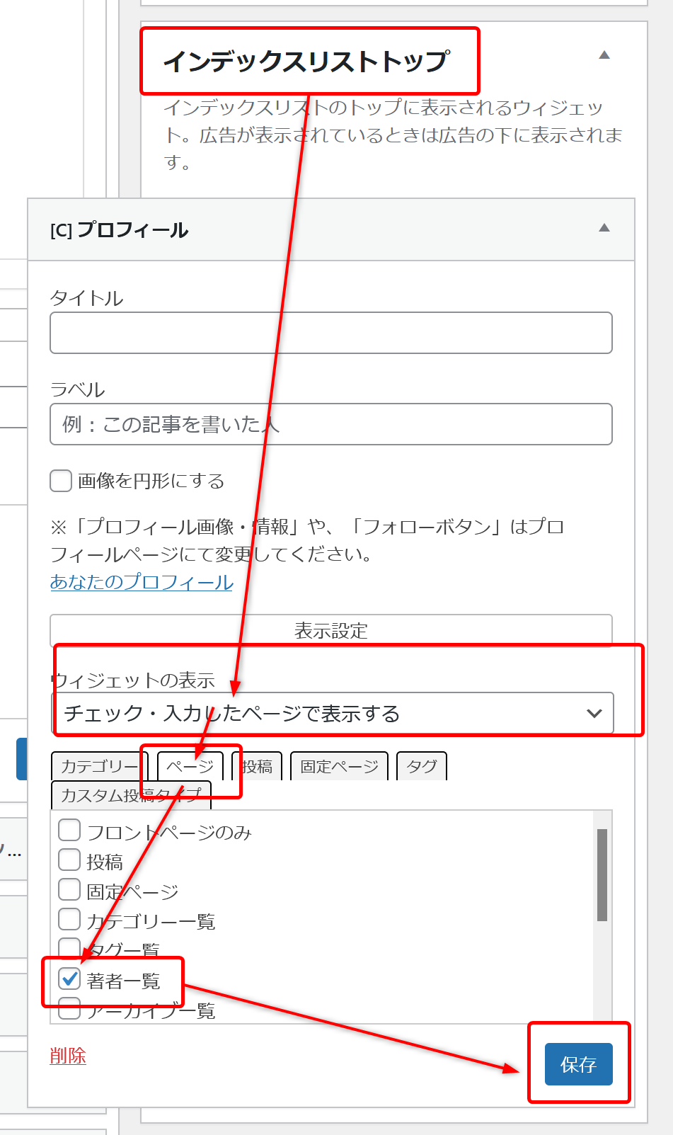 こういったページのことでしたら、ウィジェット設定画面から「インデックスリストトップ」エリアに「プロフィール」ウィジェットを入れて、「ウィジェットの表示」で「チェック・の入力したページで表示する」を選択して「ページタブ」を選択後、「著者一覧」にチェックを入れて「保存」ボタンを押せばできるかと思います。