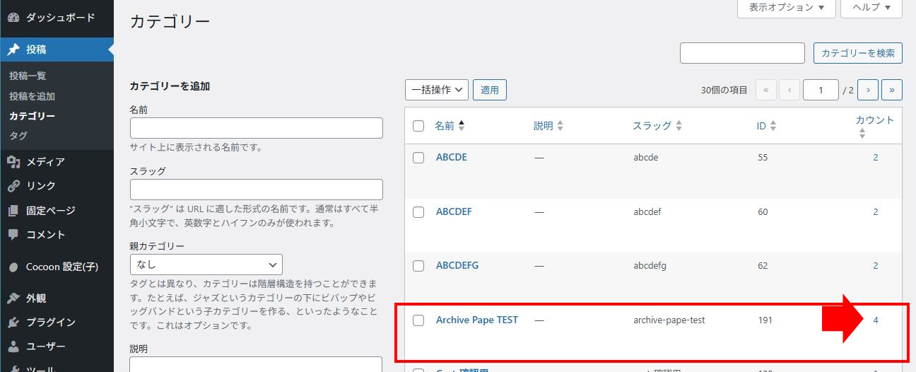 その場合のカテゴリーアーカイブページですが、以下のような表示です。