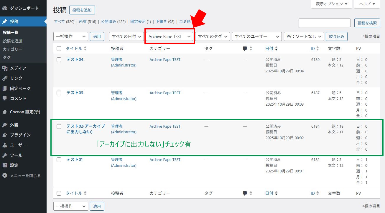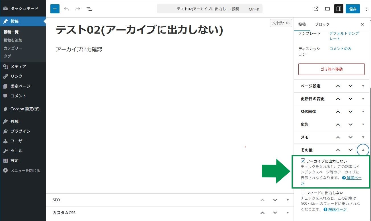 この内の1件の投稿には、「アーカイブに出力しない」にチェックがあります。