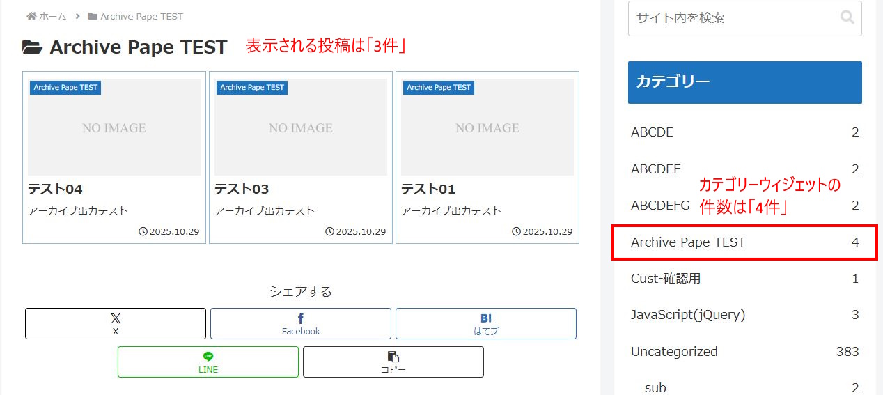 「アーカイブ」ウィジェットの投稿数も不一致になります。