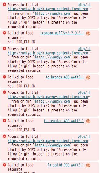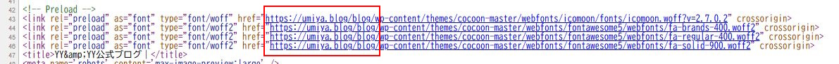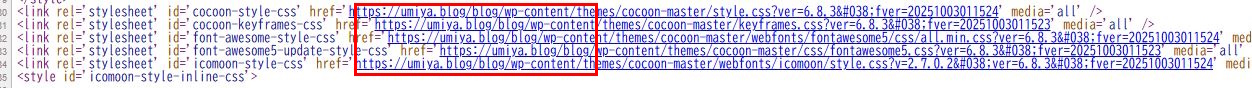 その他にも、親テーマ等の読み込みも、他サイト(https:// umiya.blog/blog/~)になっているようです。