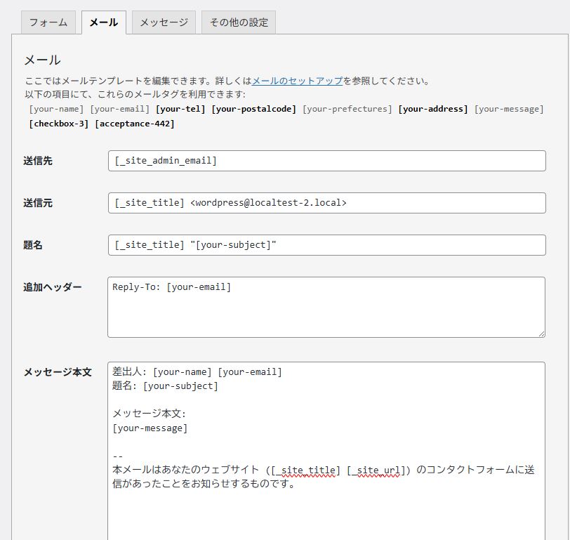 「Contact Form 7 設定」や「Contact Form 7 使い方」等で検索すると、設定方法などの解説サイトは複数見つかると思います。