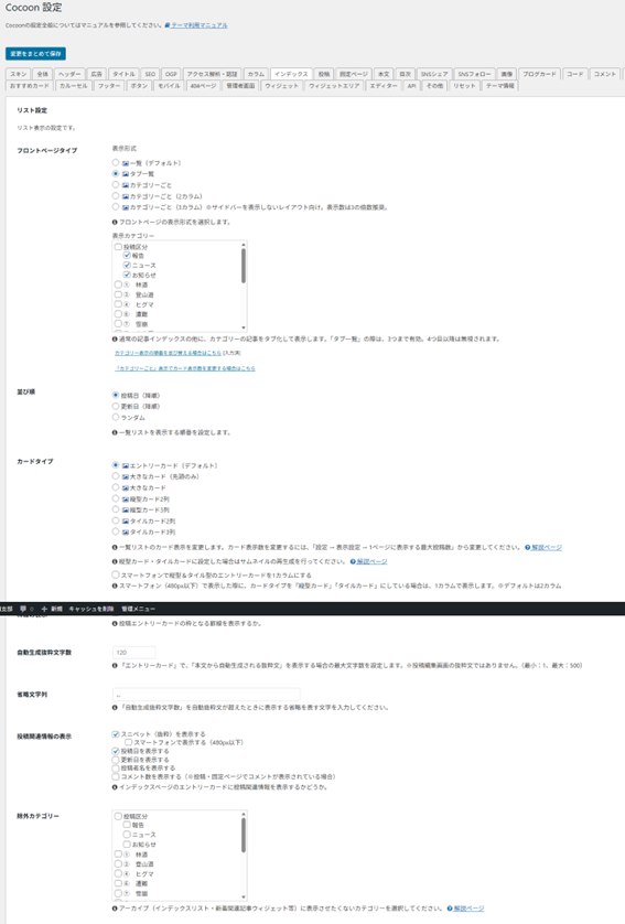 Cocoon設定から「インデックス」を選んで、フロントページタイプの表示形式を「タブ一覧」、表示カテゴリーに「投稿区分」を作り、その配下に3つの区分カテゴリー(私の場合、「報告」、「ニュース」、「お知らせ」の3つ)にチェックを入れて、カテゴリー表示の順番として、カテゴリー順の変更のカテゴリーIDをカンマ区切りで入れて、「変更をまとめて保存」をクリックして、サイトを開いても、フロントページ下部に「タブ切り替え」による投稿一覧が表示されない状況です。