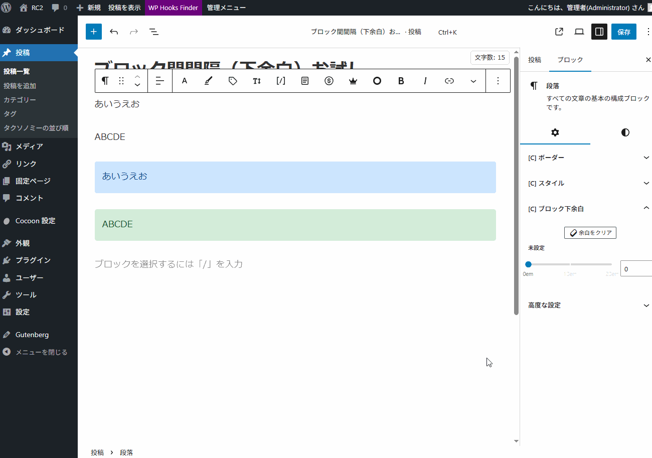 Cocoonの場合、「ブロック下余白」を、ブロックエディタで調整できます。