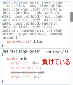 デベロッパツールで確認したオレンジ部分の.has-text-align-centerがmargin-bottom: 46.8pxとありました。