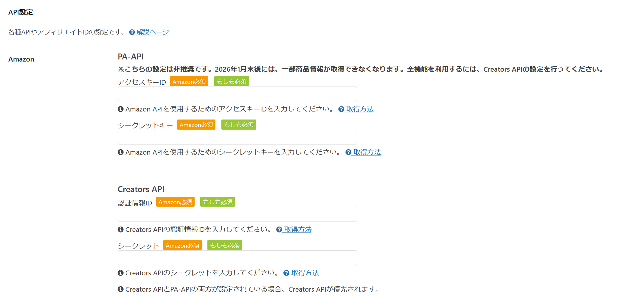 「Creators API」に変更するにしても、「Creators API」と「PA API」キーの入力欄双方を設置して、「Creators API」を優先して使うという移行方法しかなさそうには感じます。