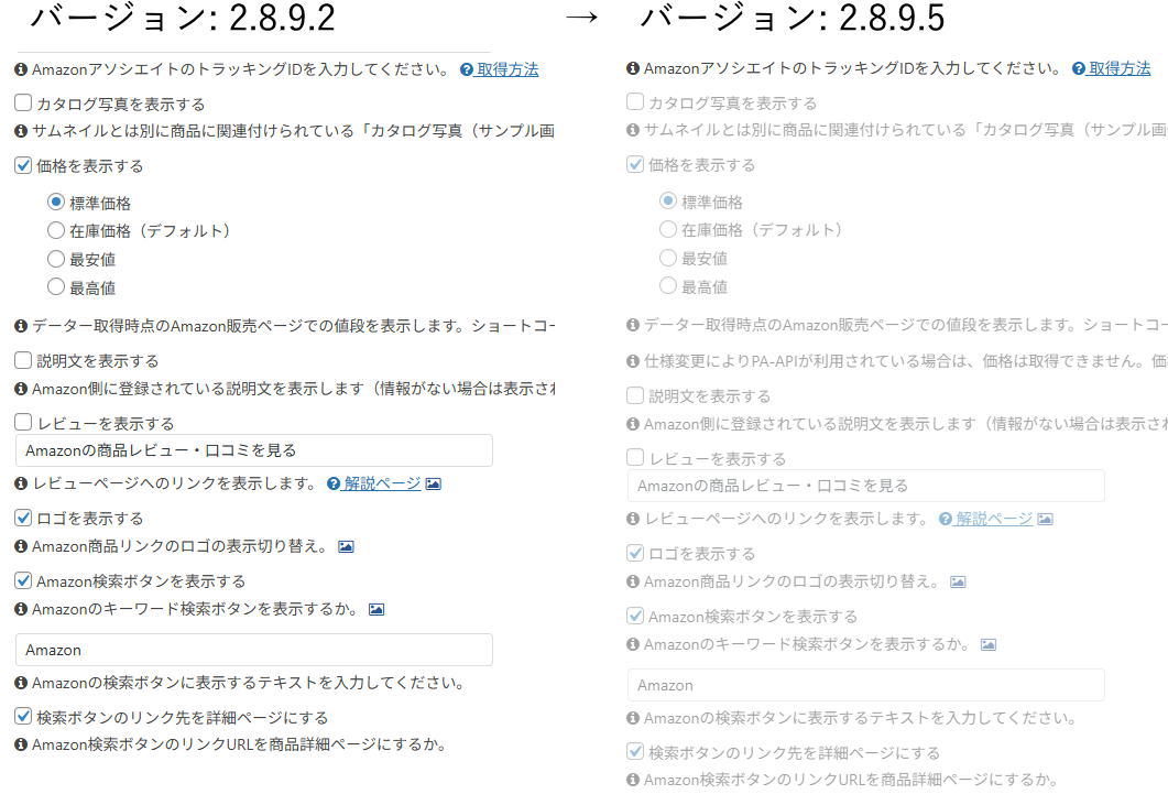 PA-APIの情報を消去せずにCreators APIの情報を追加で入力すれば、「カタログ写真を表示する」以下の項目はグレー表示になりませんでした。