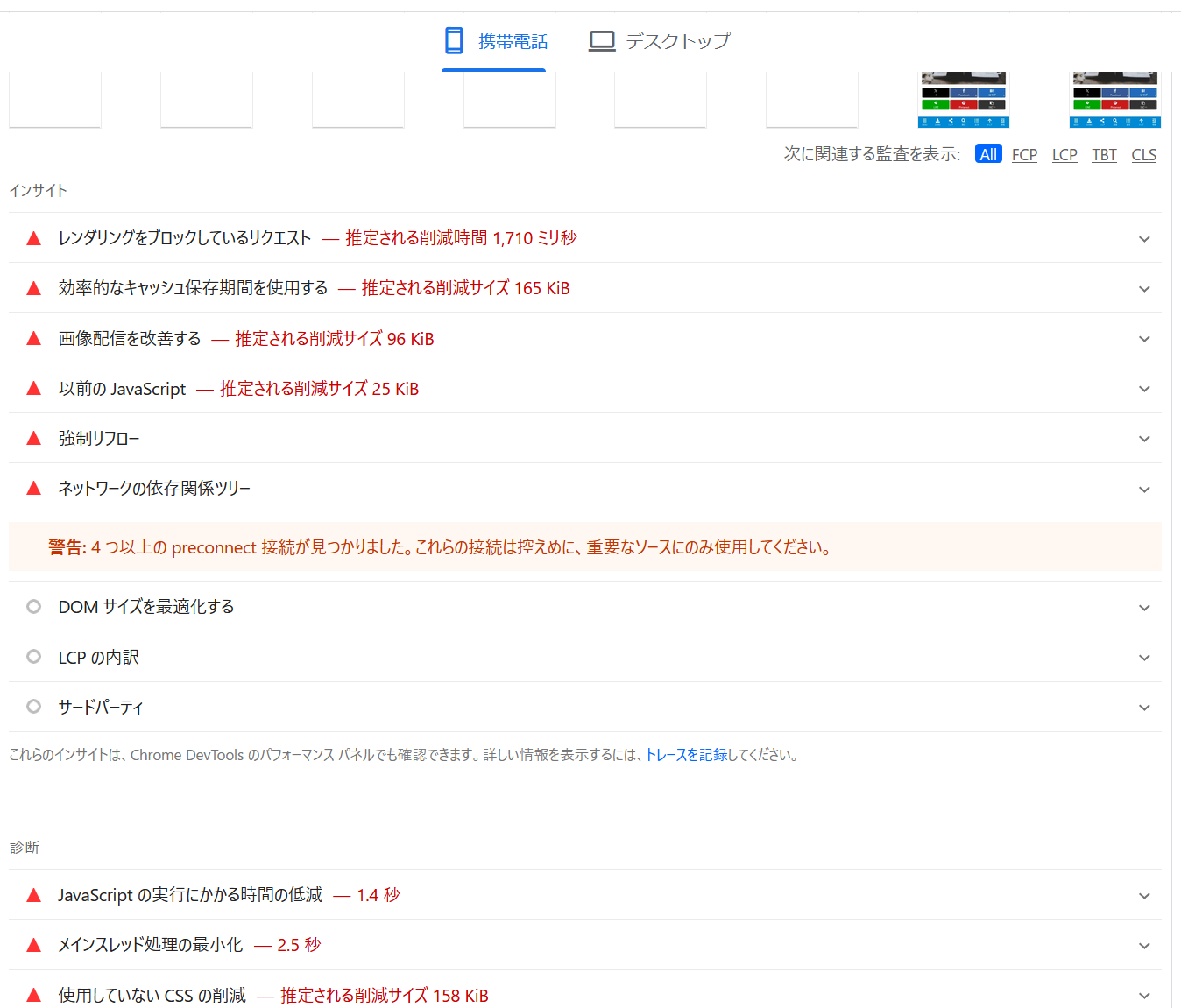 PageSpeed Insightsの各種警告は、あくまで機械的な改善の「提案」であり、すべてをゼロにする必要はありません。Cocoonのような多機能なテーマでは、仕様上どうしても出てしまう警告も一部存在するため、実害がなければ気にしなくて大丈夫だと思います。