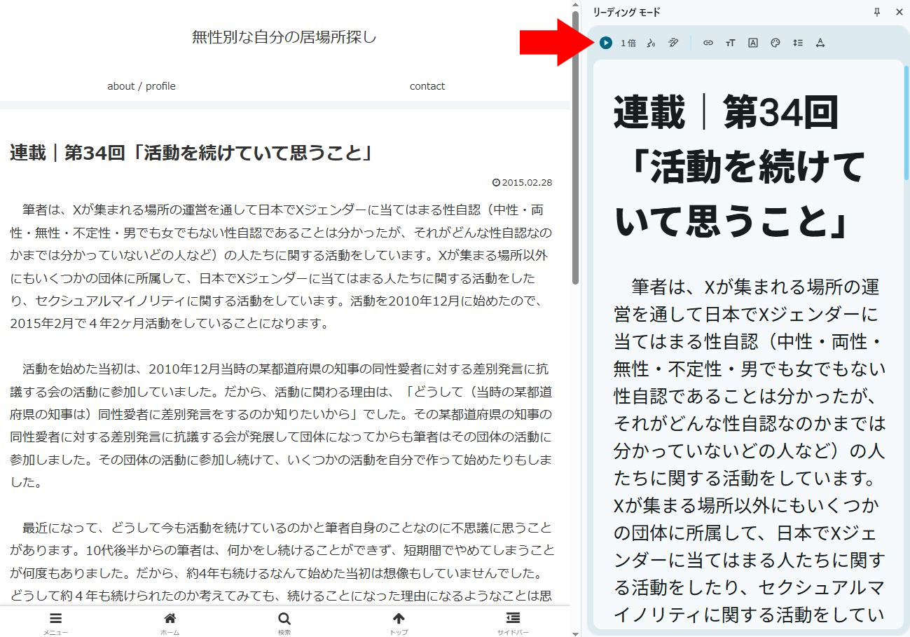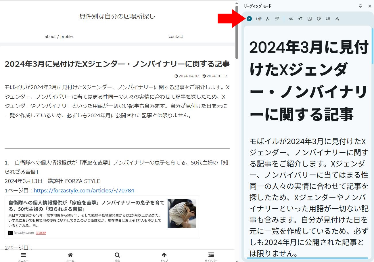 記事ページだと「このページを読み上げ」ボタンが表示されない(アドレスバーの右横にボタンは表示されず、タブの数が表示される=「このページを読み上げ」に対応しないということなり、読み上げてもらえない)