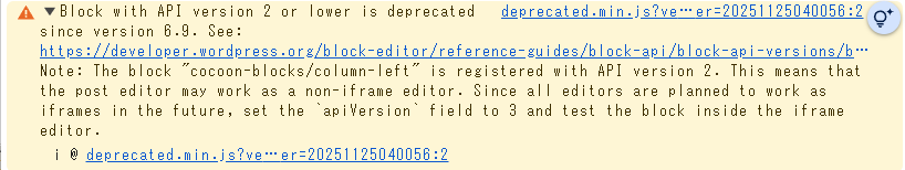 deprecated.min.js?ve…er=20251125040056:2 Block with API version 2 or lower is deprecated since version 6.9. See: https://developer.wordpress.org/block-editor/reference-guides/block-api/block-api-versions/block-migration-for-iframe-editor-compatibility/ Note: The block "cocoon-blocks/column-left" is registered with API version 2. This means that the post editor may work as a non-iframe editor. Since all editors are planned to work as iframes in the future, set the `apiVersion` field to 3 and test the block inside the iframe editor. i @ deprecated.min.js?ve…er=20251125040056:2
