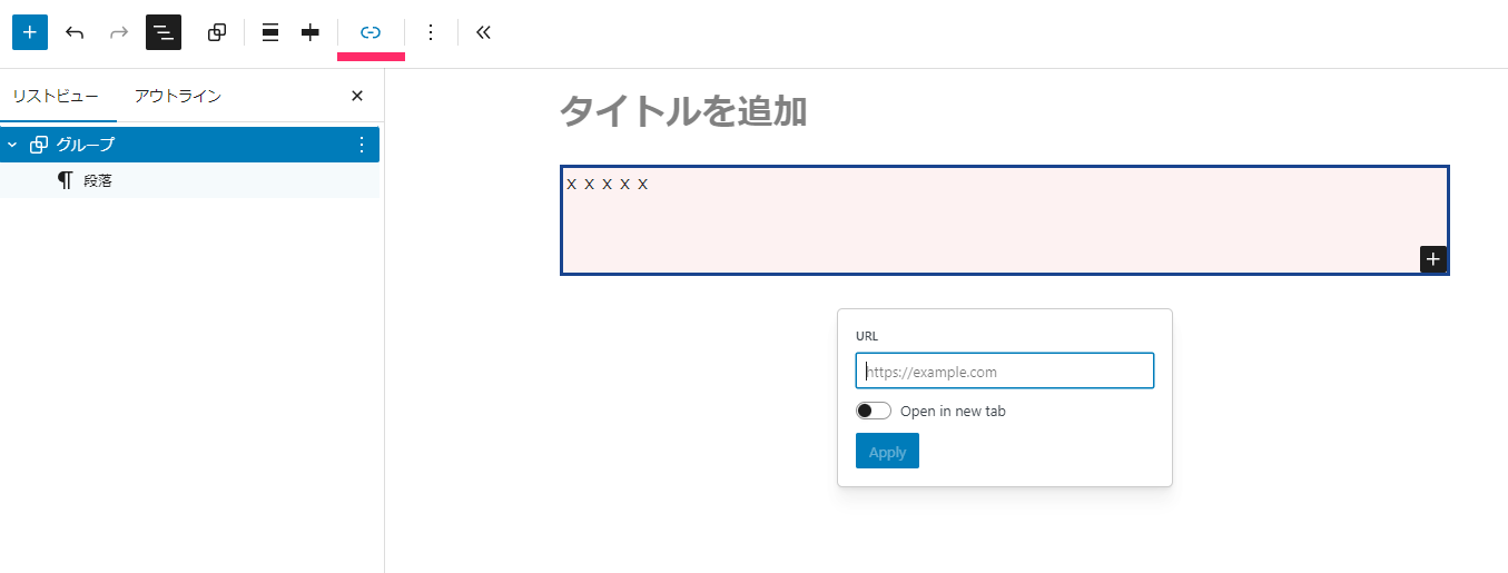 「グループ」ブロック全体にリンク設定できたらと思います。