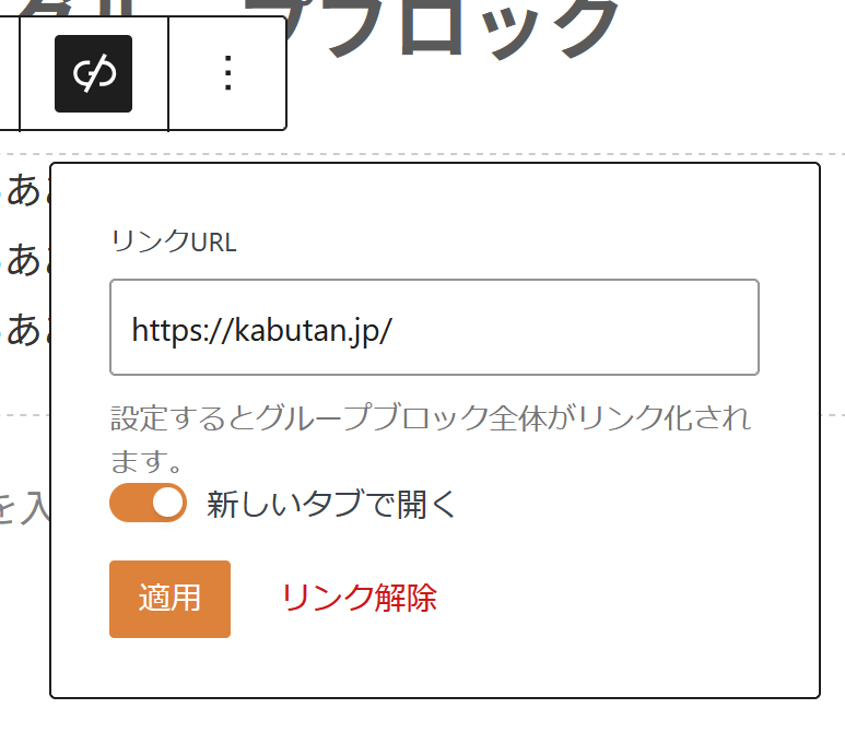 「グループ」ブロック全体にリンク設定できたらと思います。
