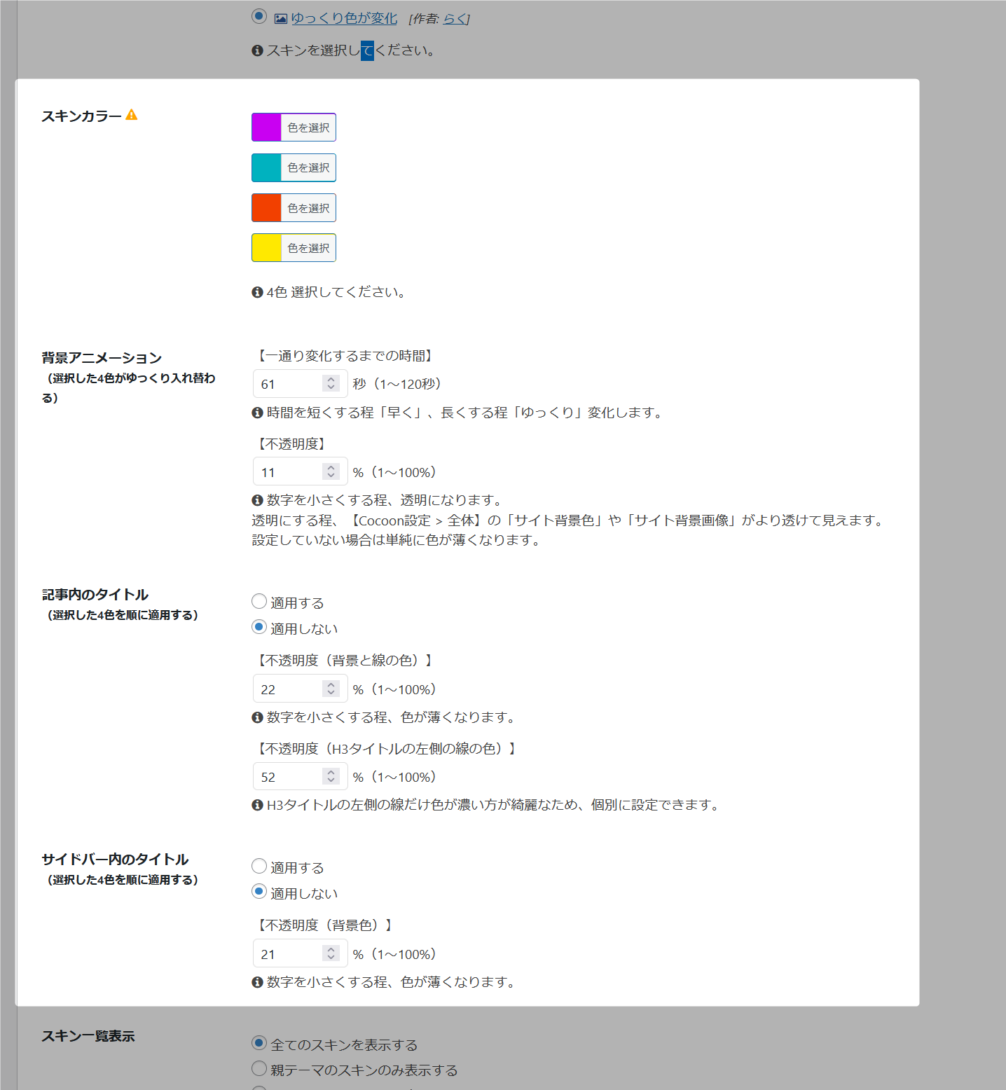 after_setup_themeを修正後、「ゆっくり色が変化」スキンでコンソールエラーが出たりカラーピッカーが出なかったりして、まともに動作しなかったので、修正に手間取ってしまいました。