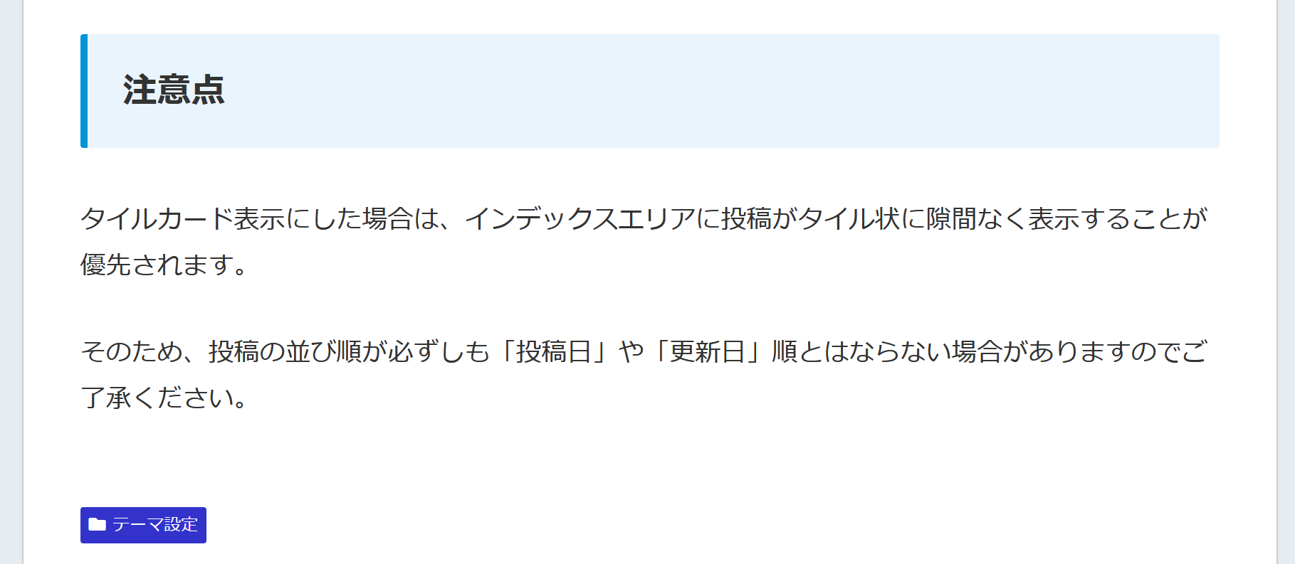 そのため、カードタイプ「タイル」では、並び順が必ずしも「投稿日」や「更新日」順にならない。