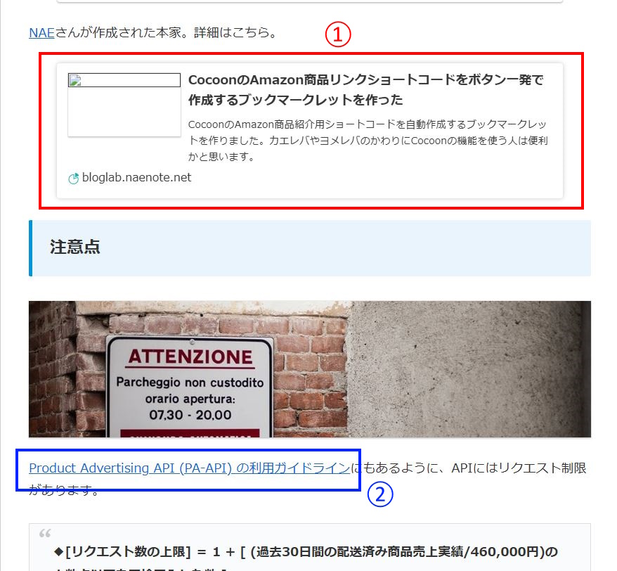 ①のブログカード部分ですが、サムネイルが表示されていないですけれど。