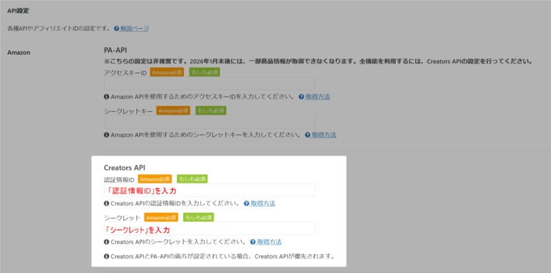 2026年1月31日以降も価格情報等を表示したい場合は、AmazonのAPI設定をCreators APIの設定に変更する必要があります。