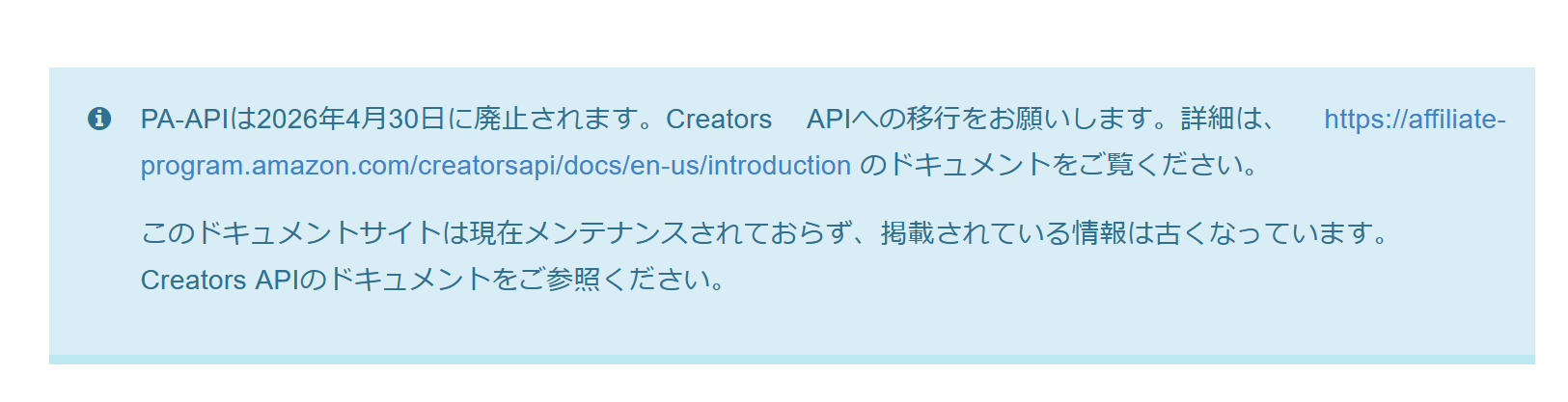 2026年4月30日に廃止されますPA API。4月30日に廃止されます。PA API公式ページに書かれている内容がこちら。